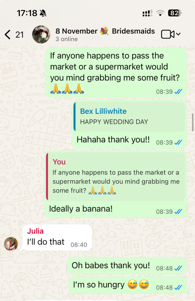 Picture the scene. A very exhausted Hannah manically WhatsApps her best friends and family in the early hours of her wedding, to URGENTLY bring a banana. That was the situation. And they did. With gusto. My brother even returned from Jerez market with two kilos of grapes wrapped in paper as well.